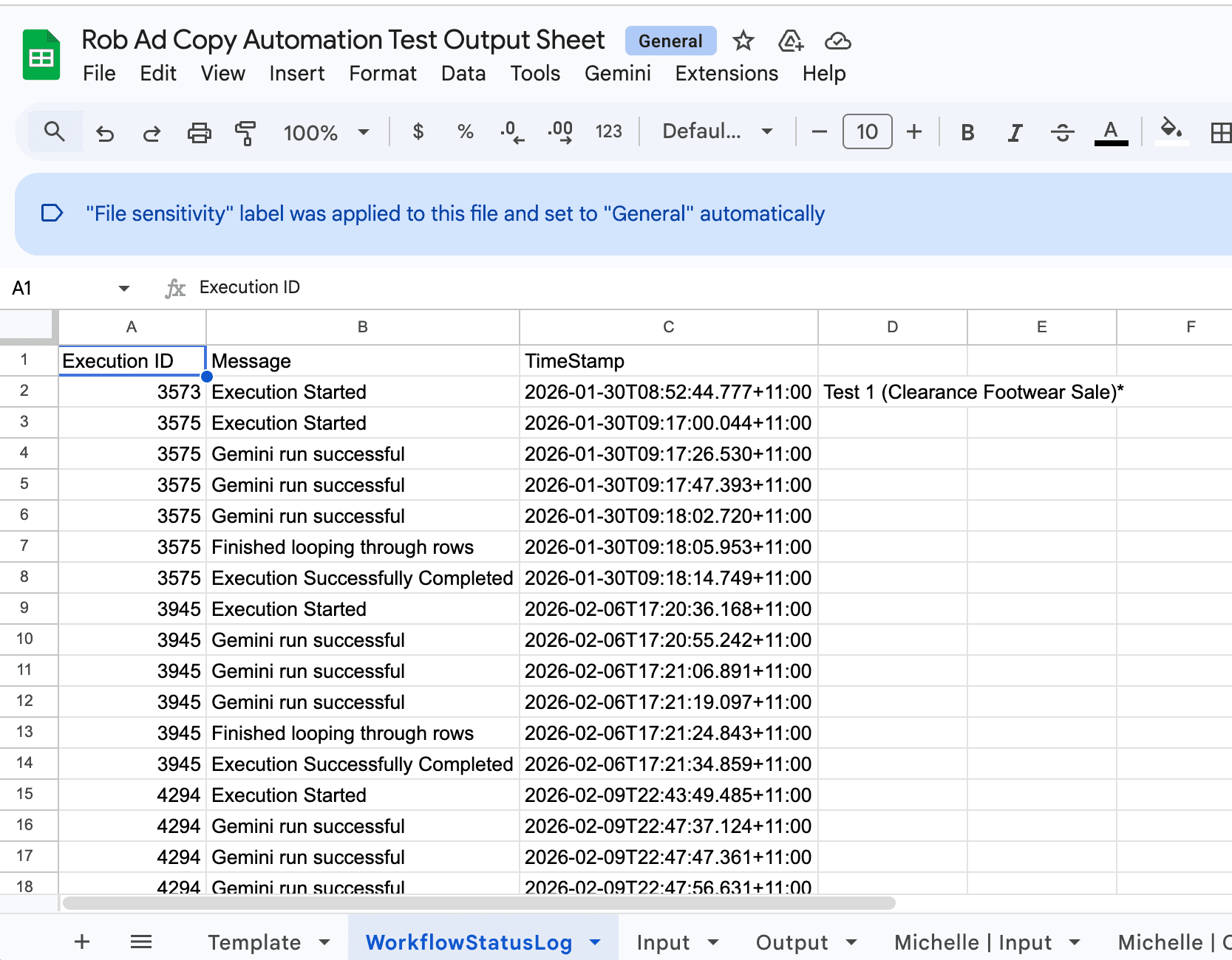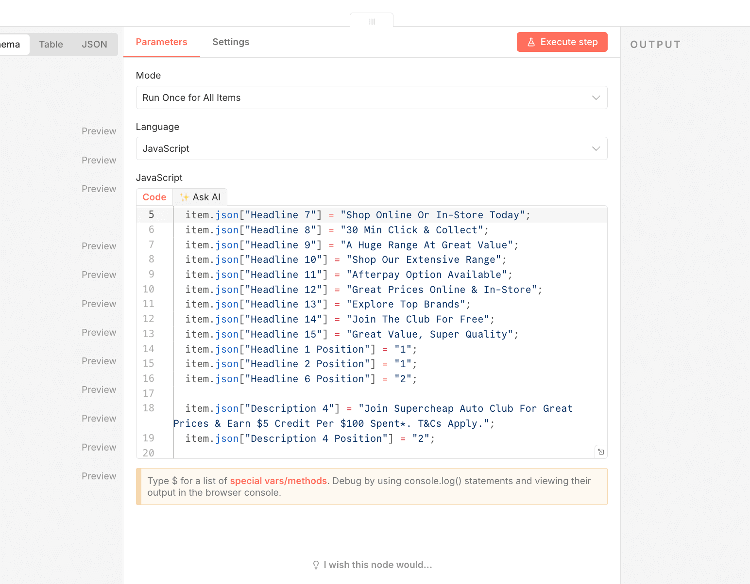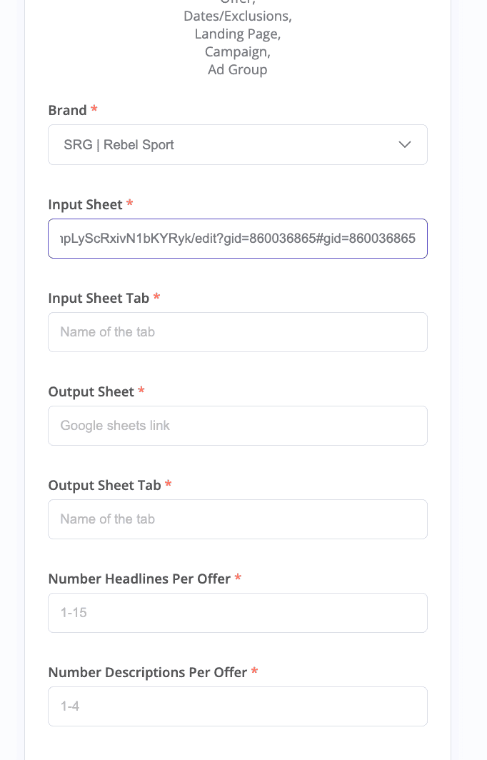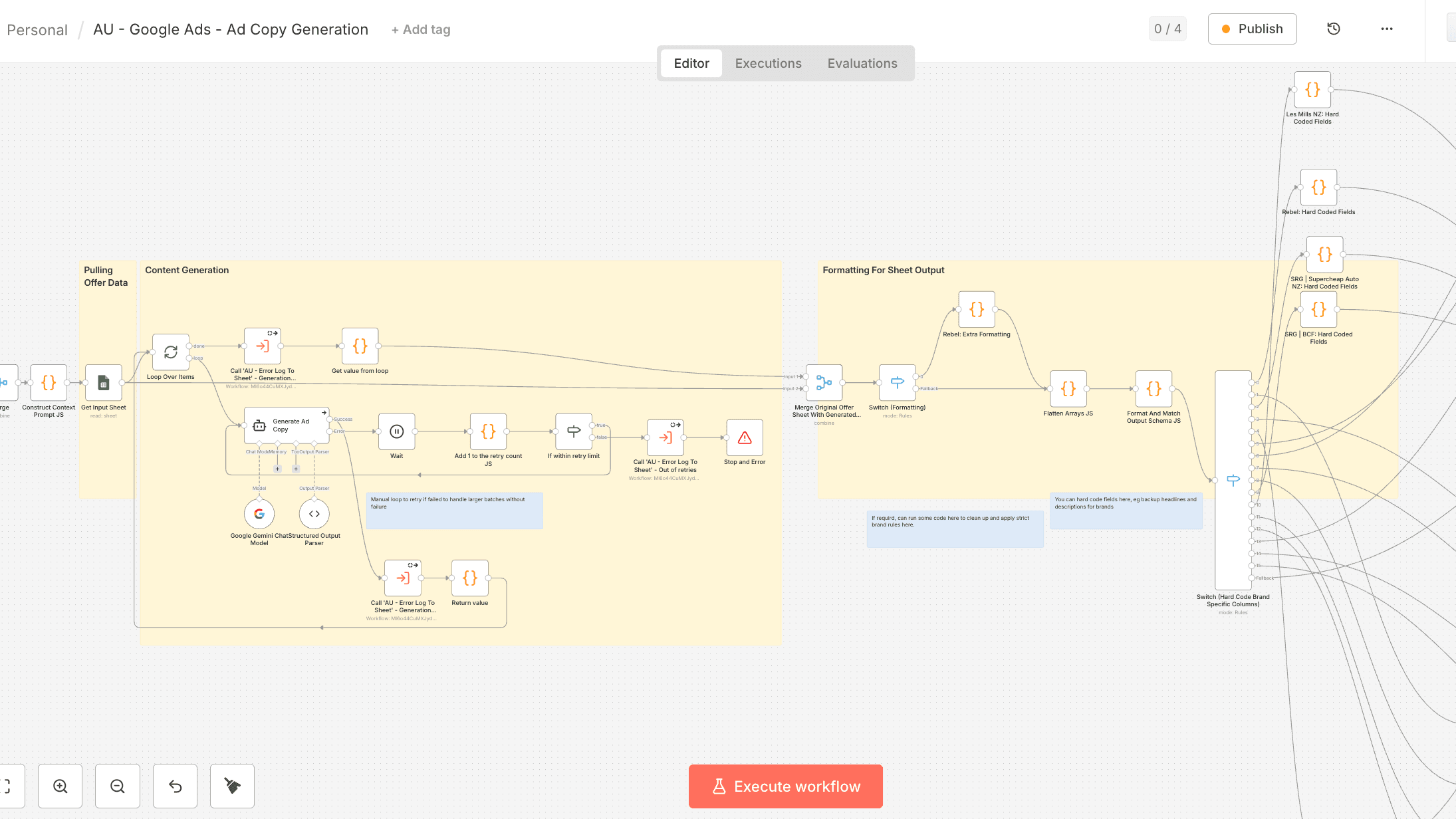 With the foundational data and structure in place, the workflow proceeded through a combination of custom coding and platform integration. The n8n automation was configured to ingest the client-specific guidelines and, crucially, integrate with the Gemini GEMs AI model that the additional copywriters, and myself had built prior. This integration allows the system to generate a high volume of descriptions and headlines for various ad platforms at scale and follow strict character guidelines.